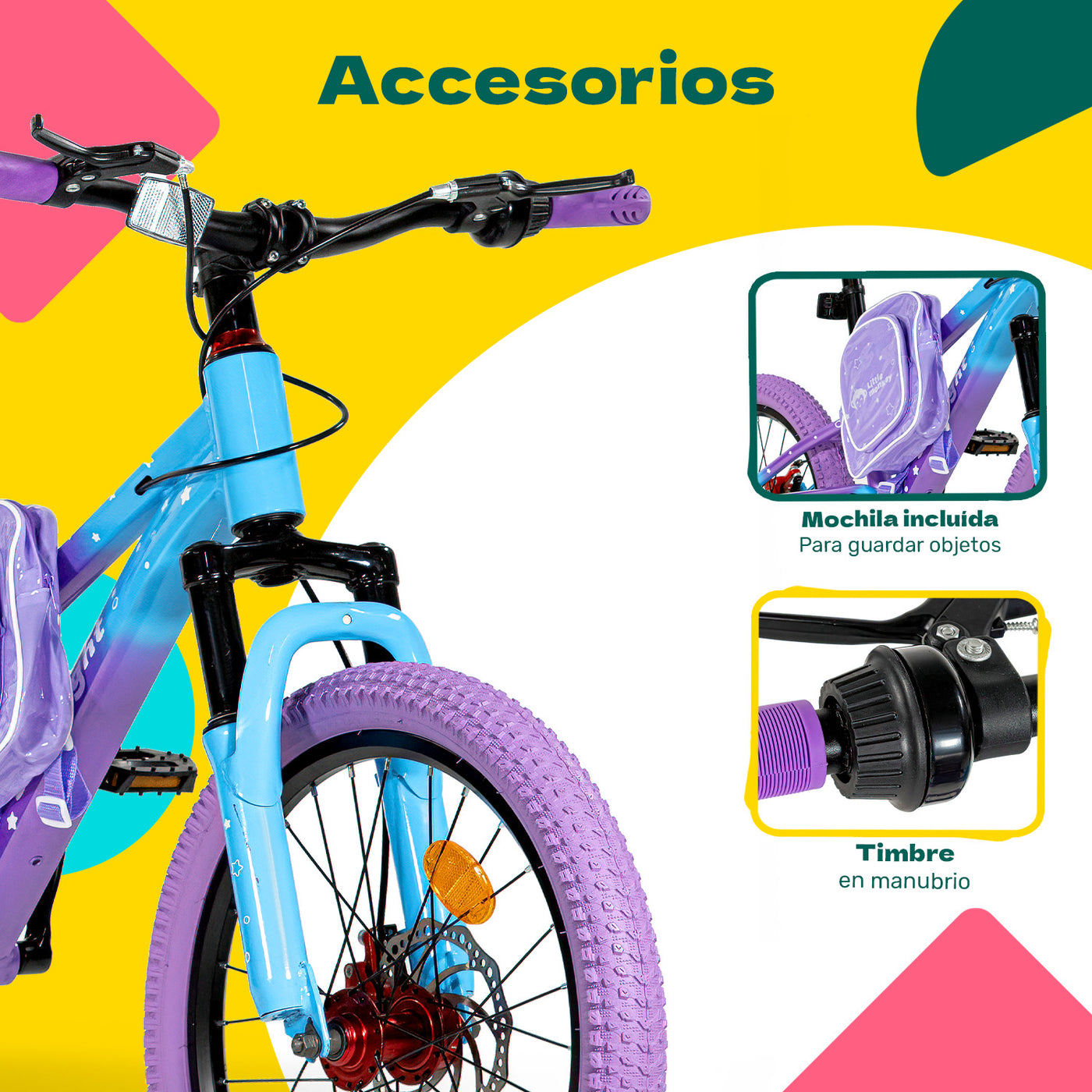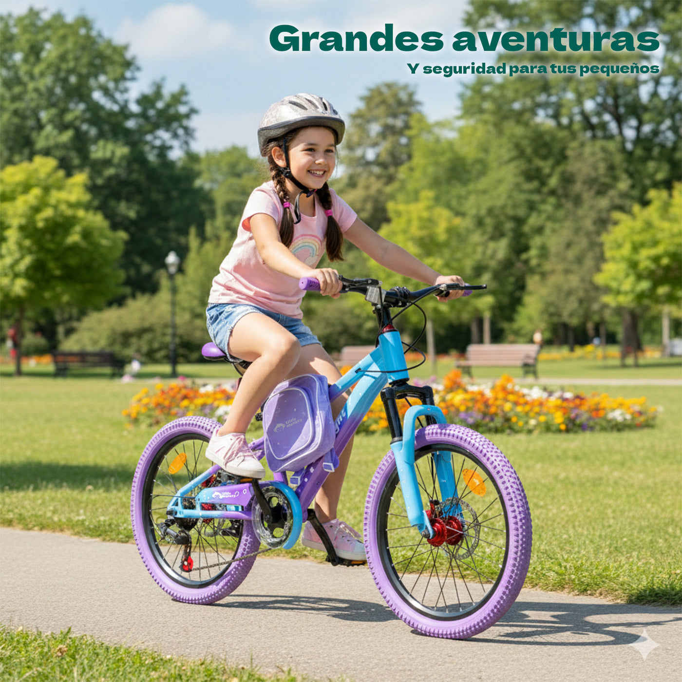 • DIVERSIÓN GARANTIZADA PARA NIÑOS A PARTIR DE 6 AÑOS. La bicicleta Starlight rodada 20 está diseñada especialmente para los pequeños aventureros. Con su mochila incluida, tus hijos podrán llevar sus juguetes, libros o cualquier accesorio mientras disfrutan de paseos emocionantes por el parque o el vecindario. ¡Ideal para fomentar el amor por el aire libre!