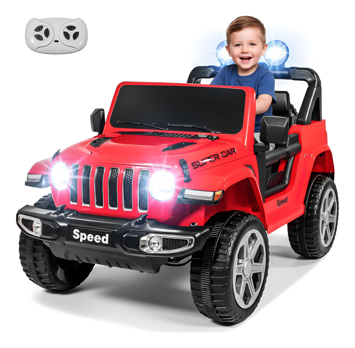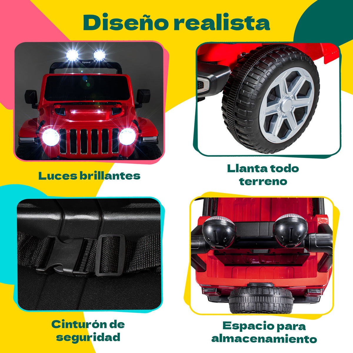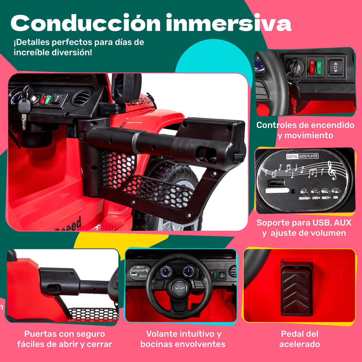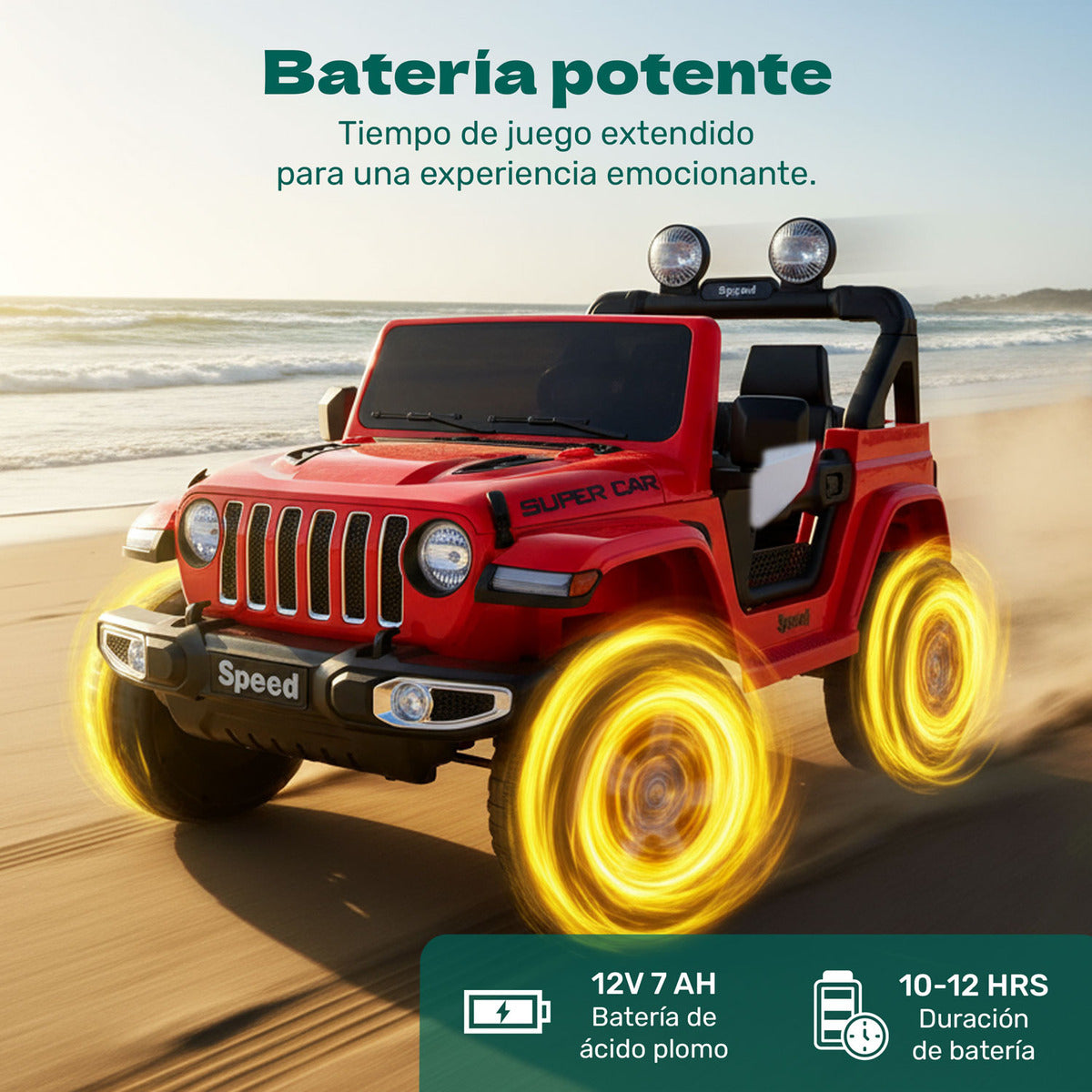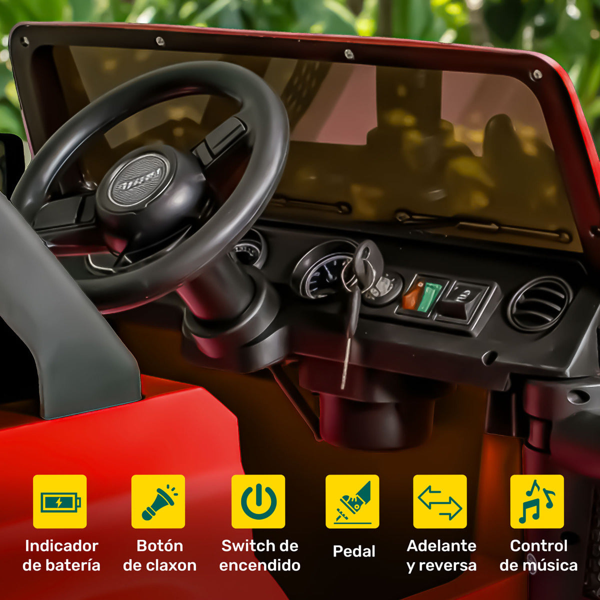 Dos asientos con cinturón, espacio para piernas y porta equipaje trasero. Los padres pueden usar el control remoto con alcance de 50 metros, mientras los niños exploran con pedal, volante funcional y palanca de dirección.