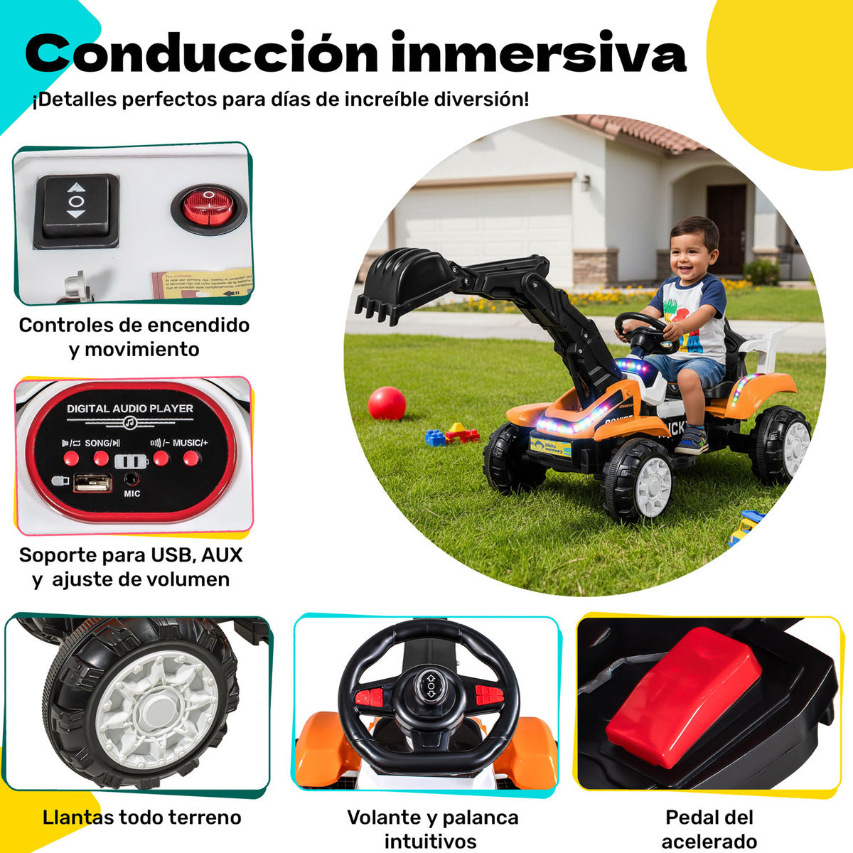 • Con una batería de 6V4.5A y un motor robusto, esta excavadora es segura y confiable. Diseñada para niños de 36 a 96 meses, tiene una velocidad de 2-4 km/h y una capacidad máxima de carga de 30 kg.