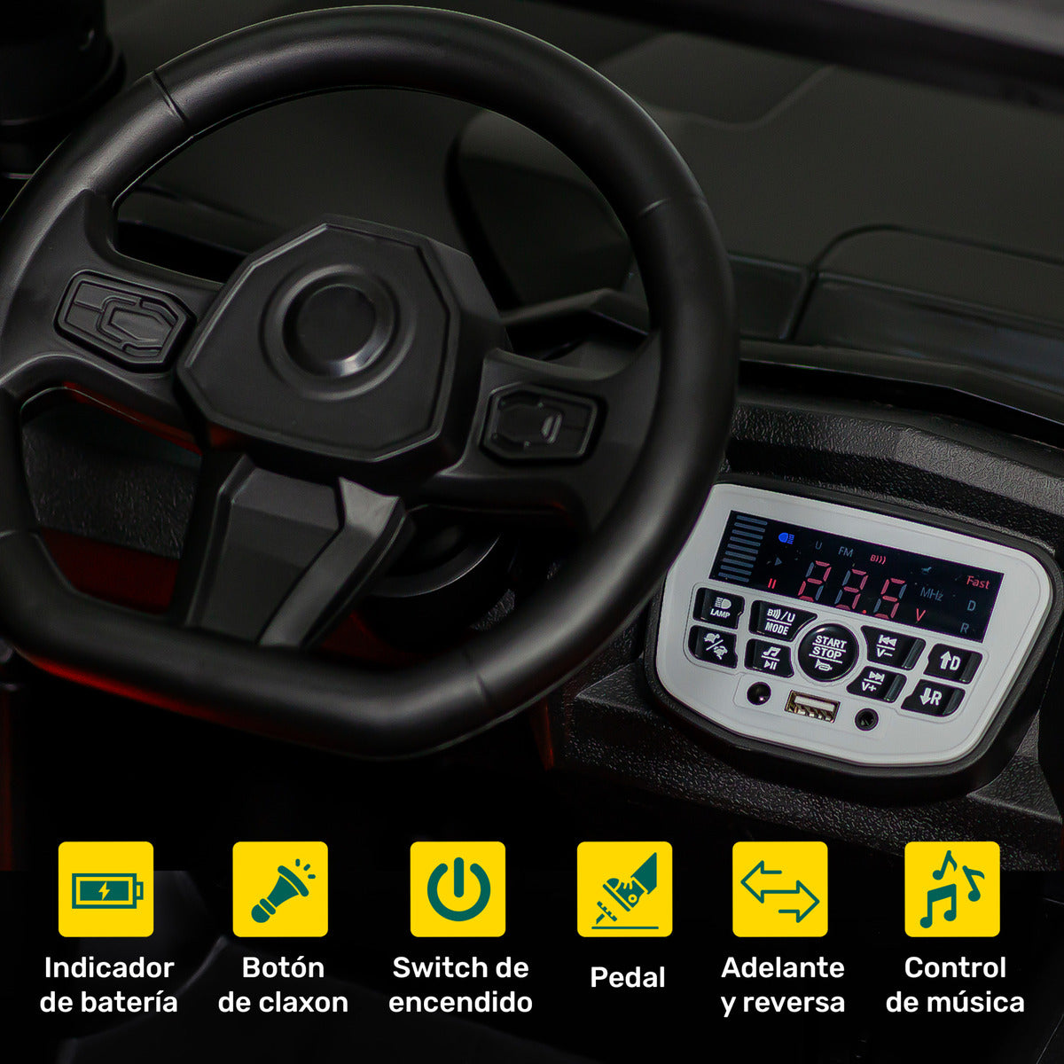 Incluye una entrada USB para reproducir música desde dispositivos externos y mantener a los niños entretenidos. Cuenta con un control de velocidad ajustable para adaptarse a diferentes habilidades de conducción.