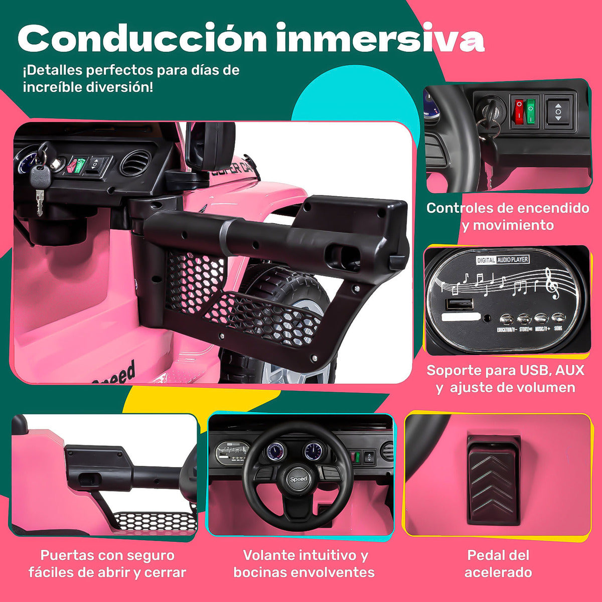 Con entradas USB, auxiliar para micrófono y modo Bluetooth, esta camioneta reproduce música, canciones infantiles, historias y efectos. ¡Conecta el celular y personaliza cada paseo con sus sonidos favoritos!