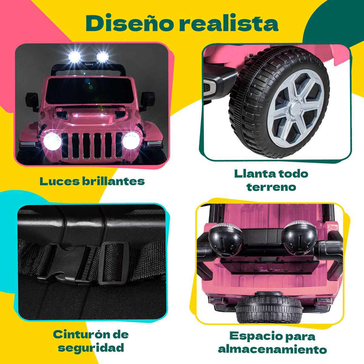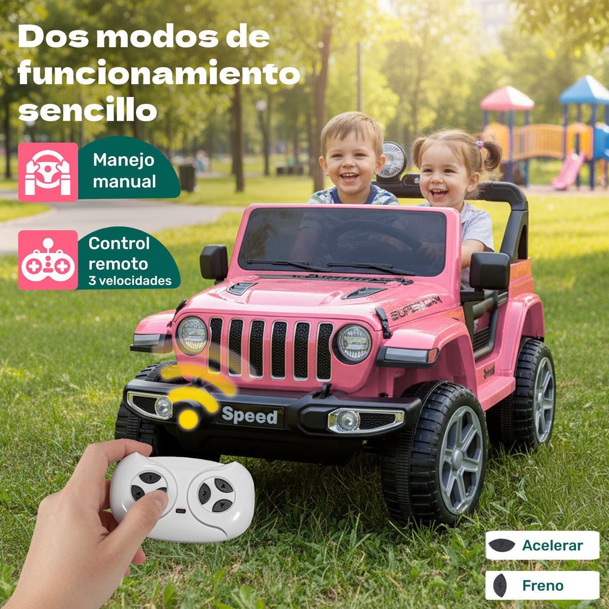 Dos asientos con cinturón, espacio para piernas y porta equipaje trasero. Los padres pueden usar el control remoto con alcance de 50 metros, mientras los niños exploran con pedal, volante funcional y palanca de dirección.