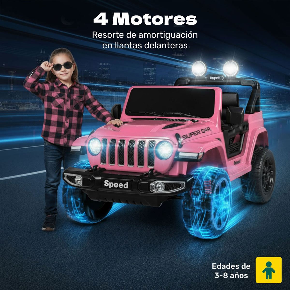 Con tracción 4x4 trasera y delantera, esta camioneta cuenta con 4 motores para un manejo firme y emocionante. Su diseño robusto y tamaño amplio le dan la presencia y el poder que cualquier conductor pequeño necesita.