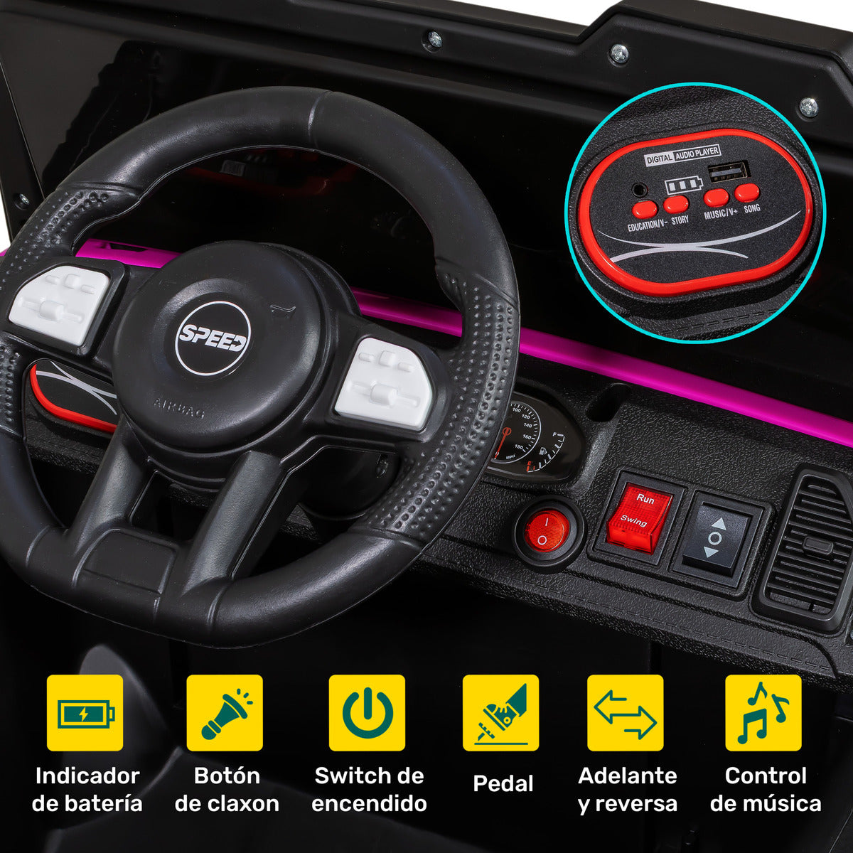 Esta camioneta urbana combina diseño moderno con funciones interactivas: luces, sonido, modo mecedora y conexión para música. Ideal para pequeños conductores que quieren moverse con ritmo y confianza.